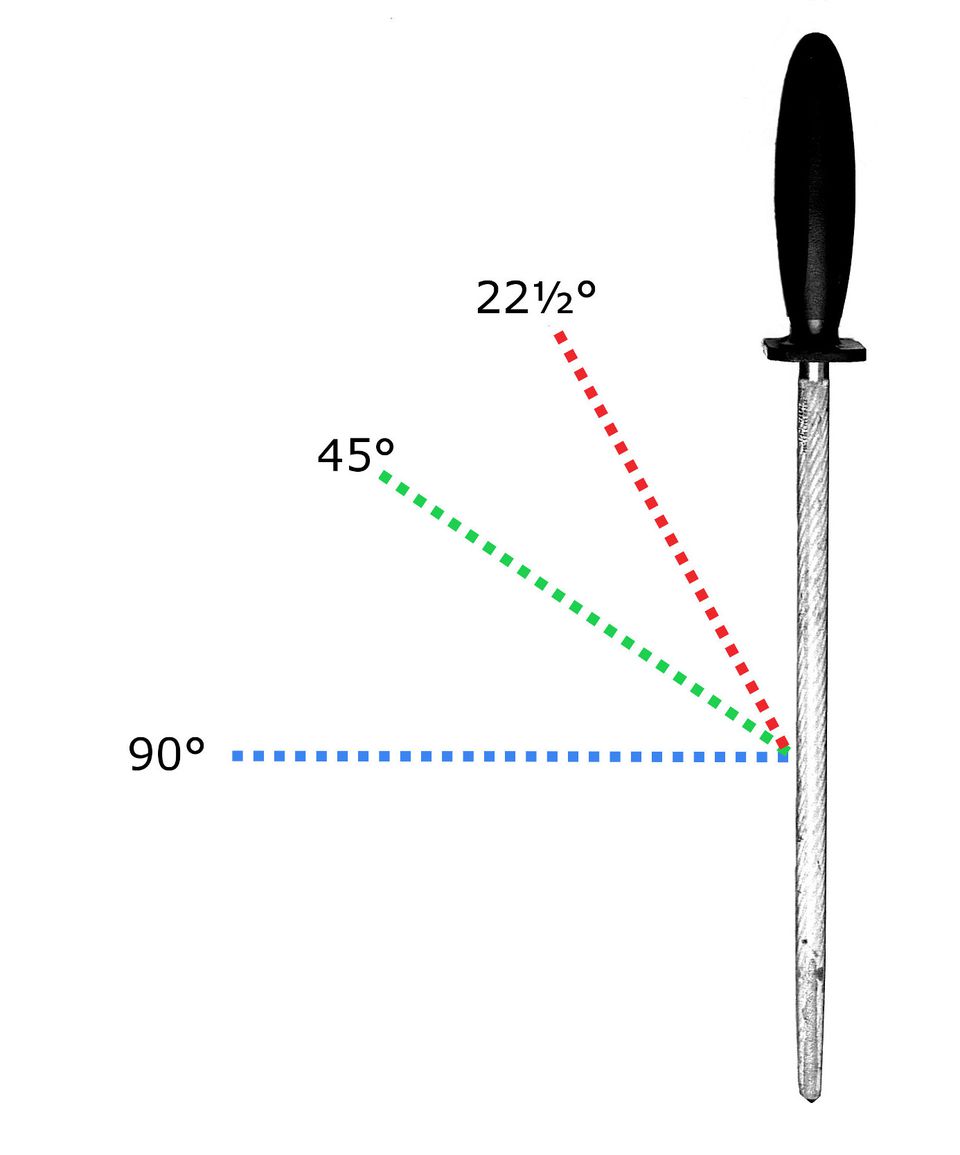 Whether you're sharpening your chef's knife on a whetstone or using a honing steel to keep it aligned, the knife's edge should meet the stone or steel at an angle of 22½ degrees.