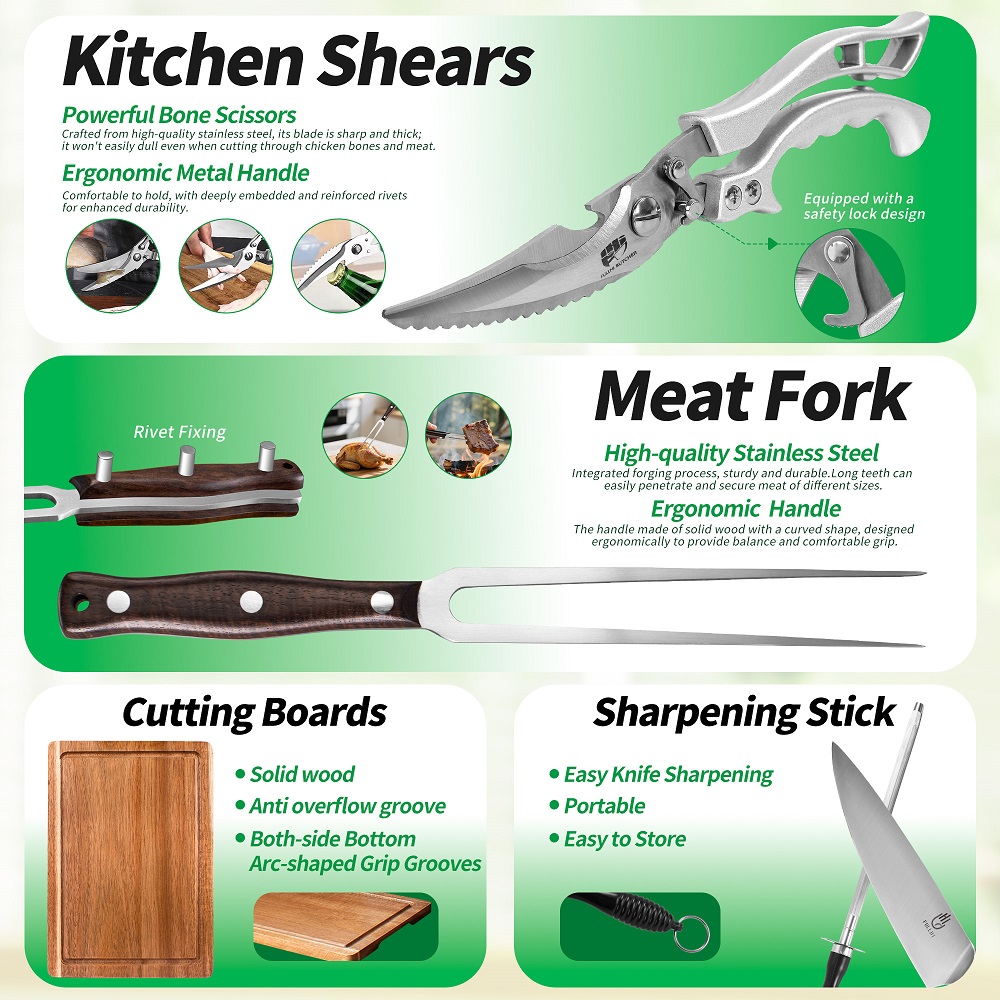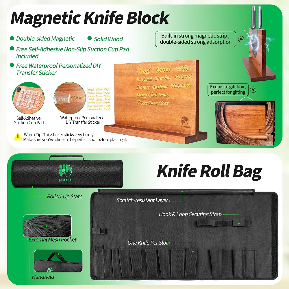 Upgrade Your Kitchen with Smart, Logical Design Why buy knives, a cutting board, a magnetic holder, and a travel bag separately? The FULLHI 19-Piece Knife Set is designed to solve your daily culinary challenges in one package.